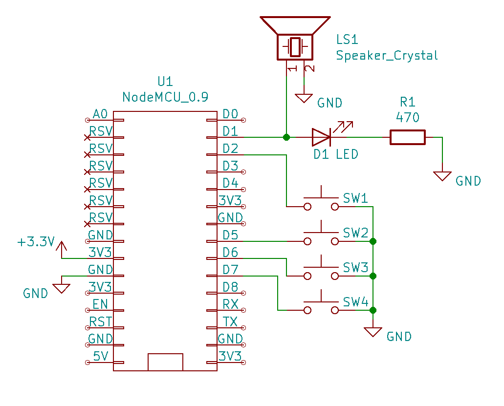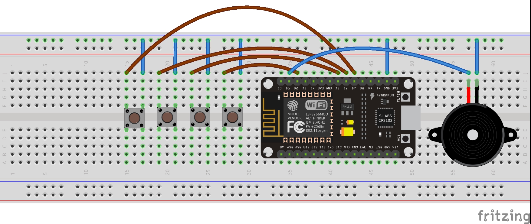 Uff, ten wpis zostanie chyba póki co rekordzistą pod względem długości! 😉 Ale to jeszcze nie koniec, mam jeszcze dla Ciebie propozycję małego projektu, który jednak może dać sporo frajdy! Do wykonania układu będziesz potrzebował brzęczyka piezo bez wbudowanego generatora. Razem z kilkoma przyciskami oraz płytką NodeMCU, pozwoli nam on stworzyć prosty instrument muzyczny. Schemat układu i sposób montażu na płytce stykowej możesz znaleźć poniżej: