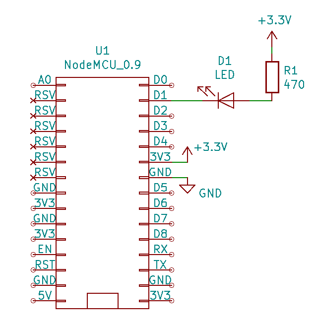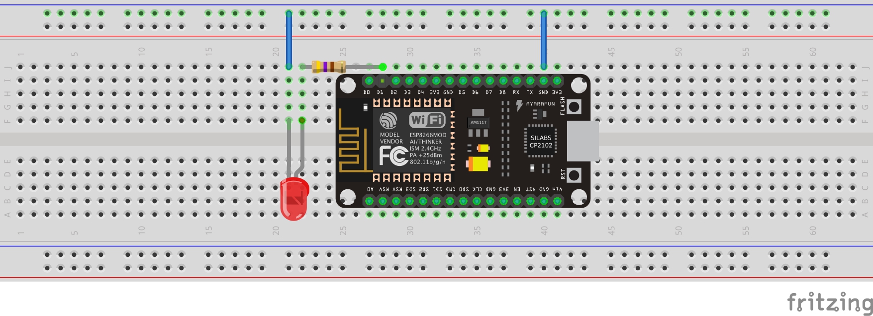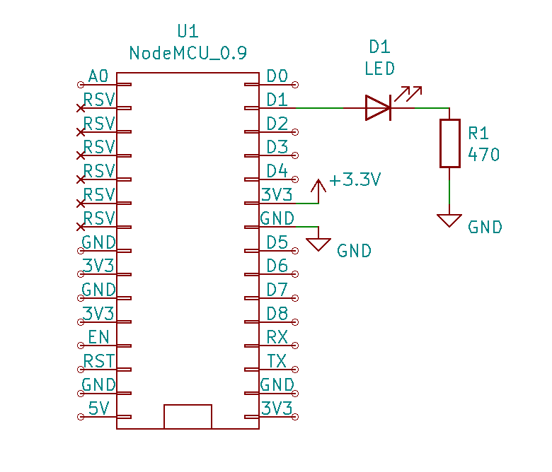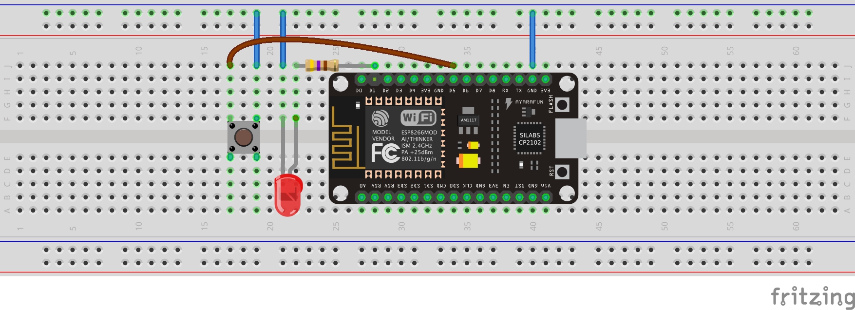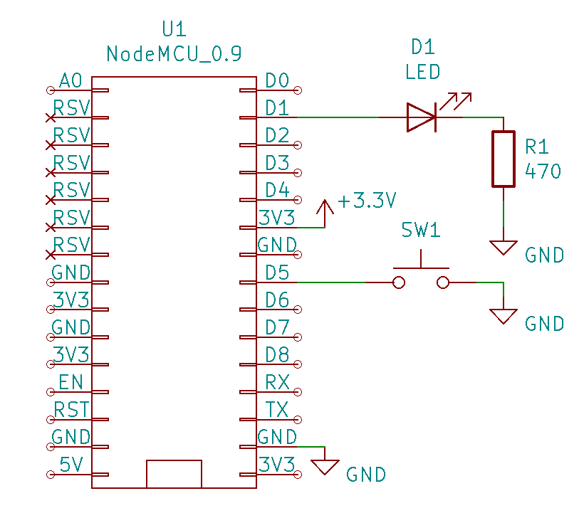 Wszelkie urządzenia pobierające prąd z wyjść cyfrowych mikrokontrolera powinny być dołączane przez rezystory o niewielkiej wartości oporu, a dodatkowo urządzenia pobierające duże ilości prądu (np. wentylatory, silniki, żarówki) powinny być sterowane przez dodatkowe układy przełączające z wykorzystaniem np. tranzystora. Pamiętaj też, że piny skonfigurowane jako wyjścia cyfrowe mogą zostać uszkodzone jeśli zostaną zwarte do dodatniej szyny zasilania lub masy (w zależności od stanu wyjścia).Jako ciekawostkę podpowiem Ci, że niebieska dioda zawarta na płytce NodeMCU jest dołączona do dodatniej szyny zasilania 3.3V za pomocą rezystora 470Ohm. Zabezpiecza to zarówno diodę jak i wyjście mikrokontrolera.