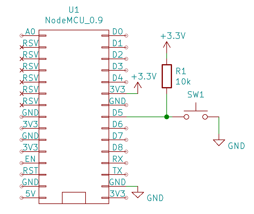 W praktyce, wyprowadzenia skonfigurowane w trybie INPUT będziesz najczęściej wykorzystywał do obsługi wszelkiego rodzaju przycisków i przełączników. Załóżmy, że podłączysz przycisk tak jak na poniższym schemacie: